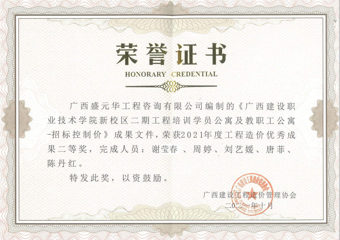 大會表彰了榮獲2021年度廣西建設(shè)工程造價優(yōu)秀成果獎的65家單位,其中我公司編制的《廣西建設(shè)職業(yè)技術(shù)學院新校區(qū)二期工程培訓學員公寓及教職工公寓——招標控制價》成果文件,榮獲2021年度廣西建設(shè)工程造價優(yōu)秀成果獎二等獎。據(jù)悉,我公司已有多個項目連年獲得廣西建設(shè)工程造價優(yōu)秀成果獎。